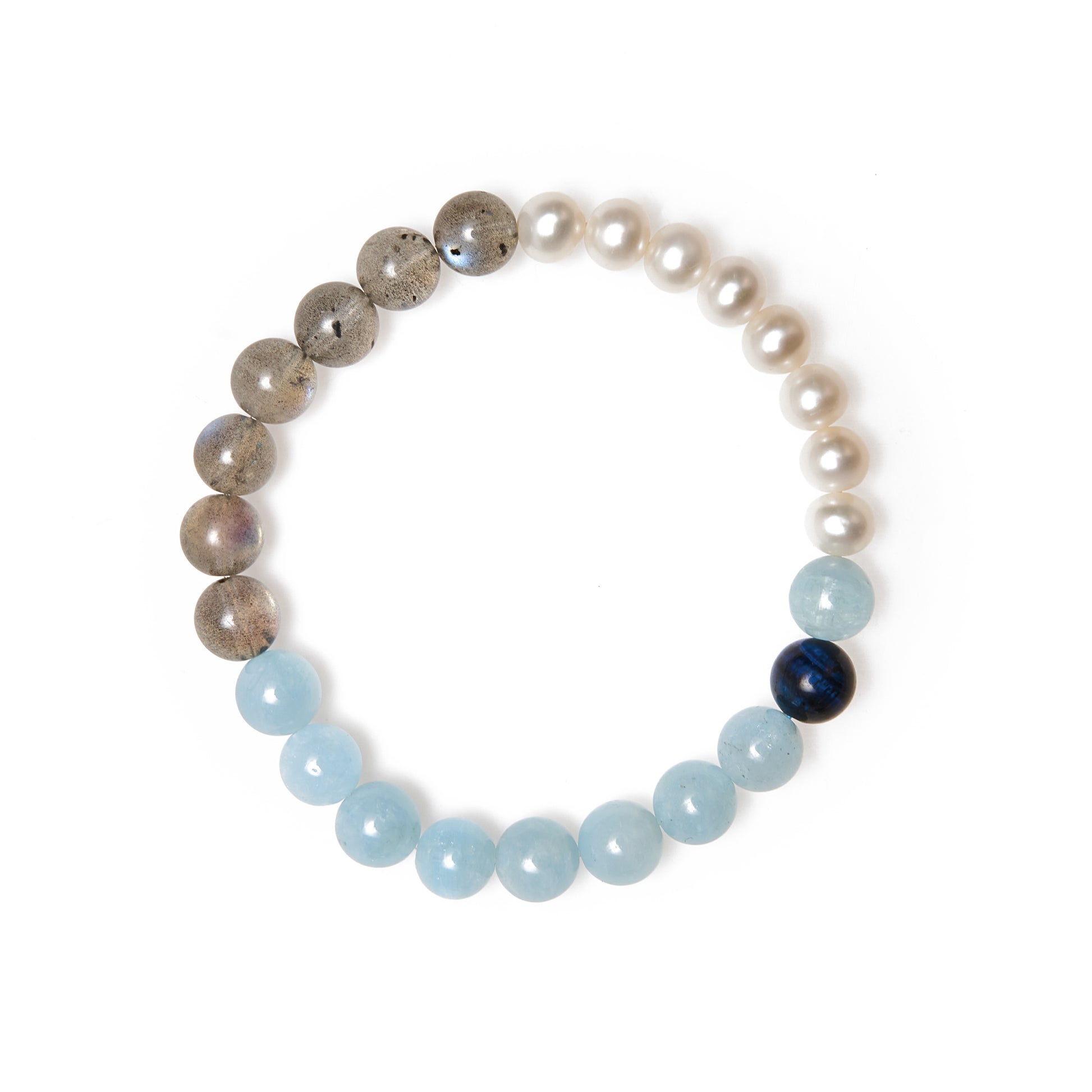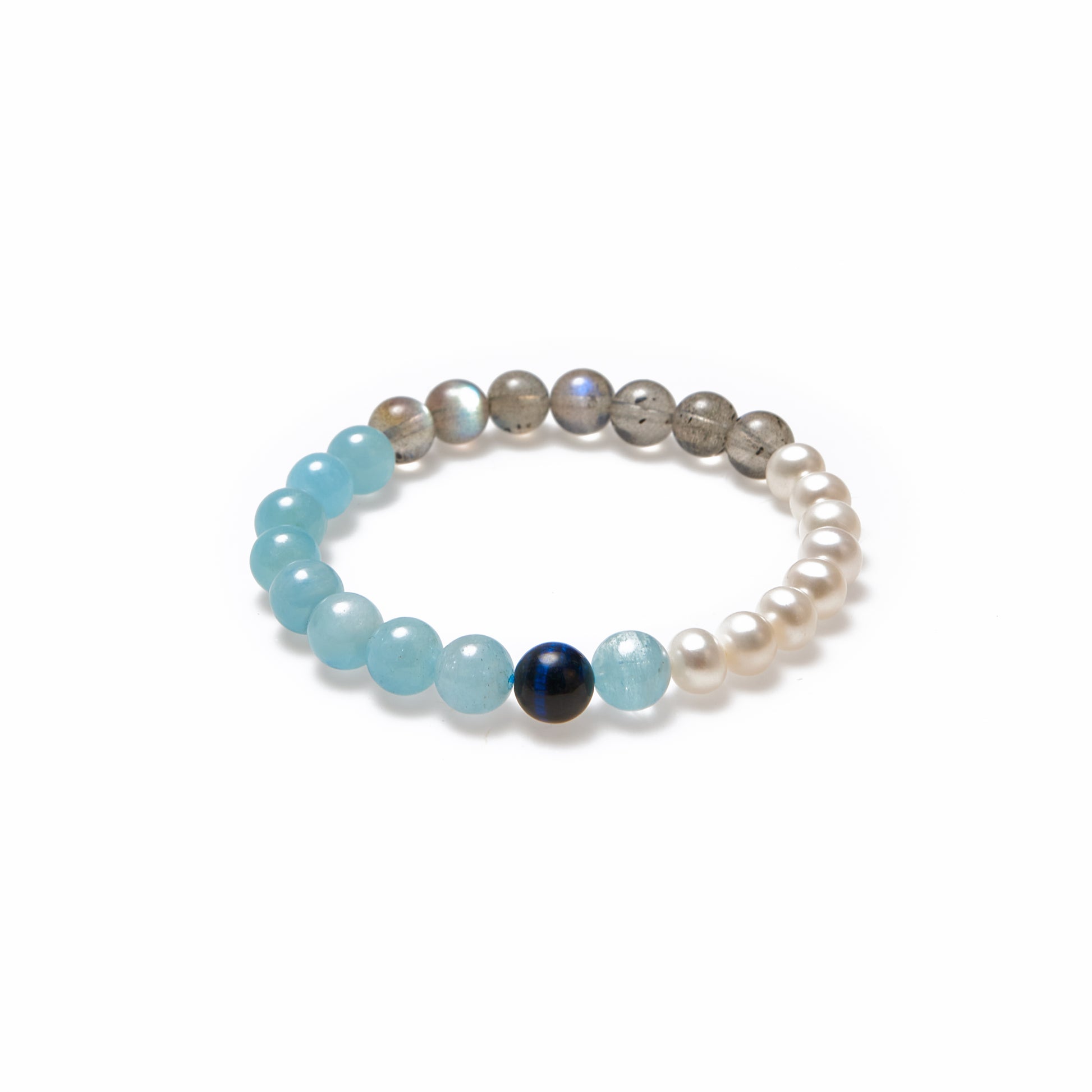 Inspired by the Ragdoll cat, with its striking blue eyes and soft gray fur, this bracelet combines blue moonstone, aquamarine, obsidian, and natural freshwater pearls.