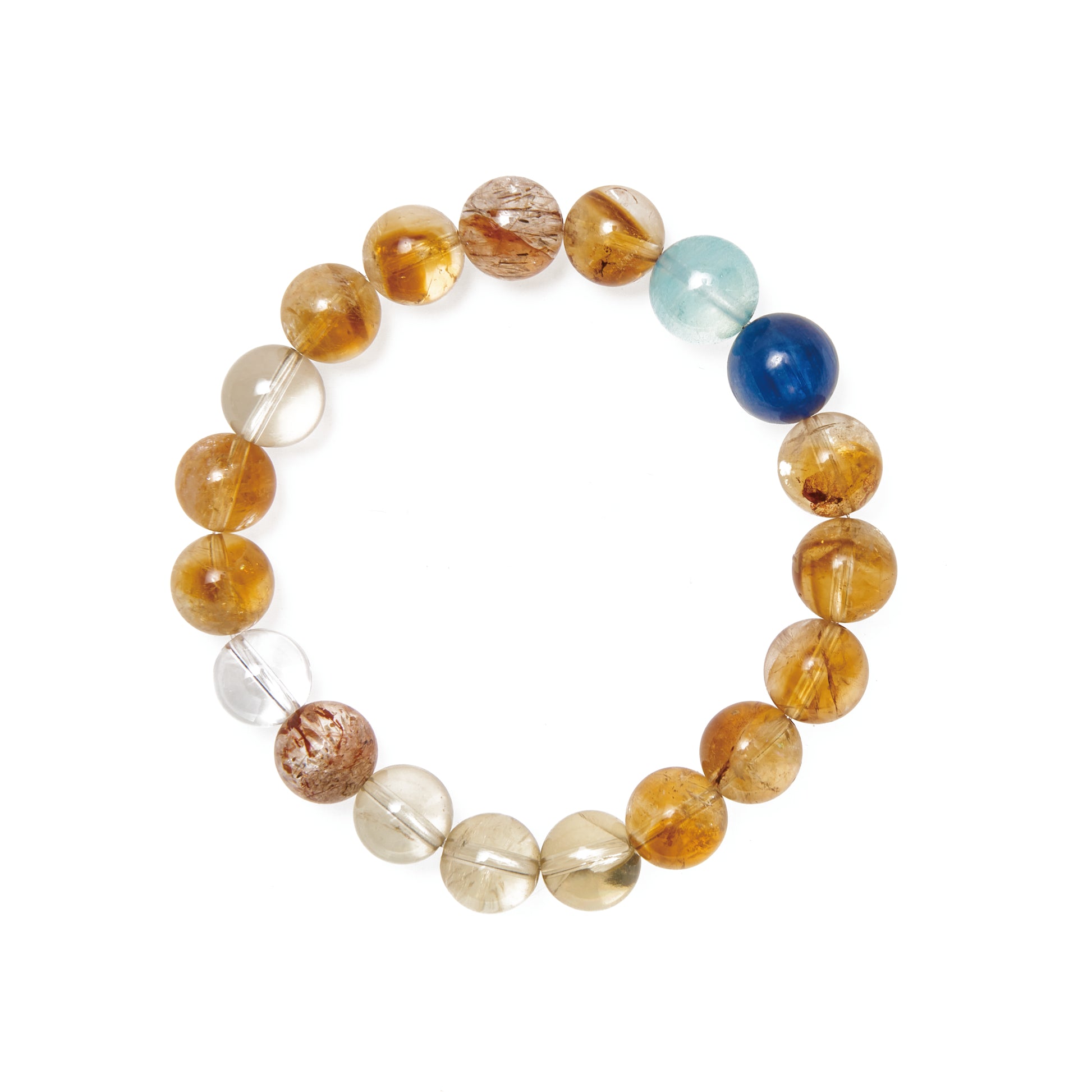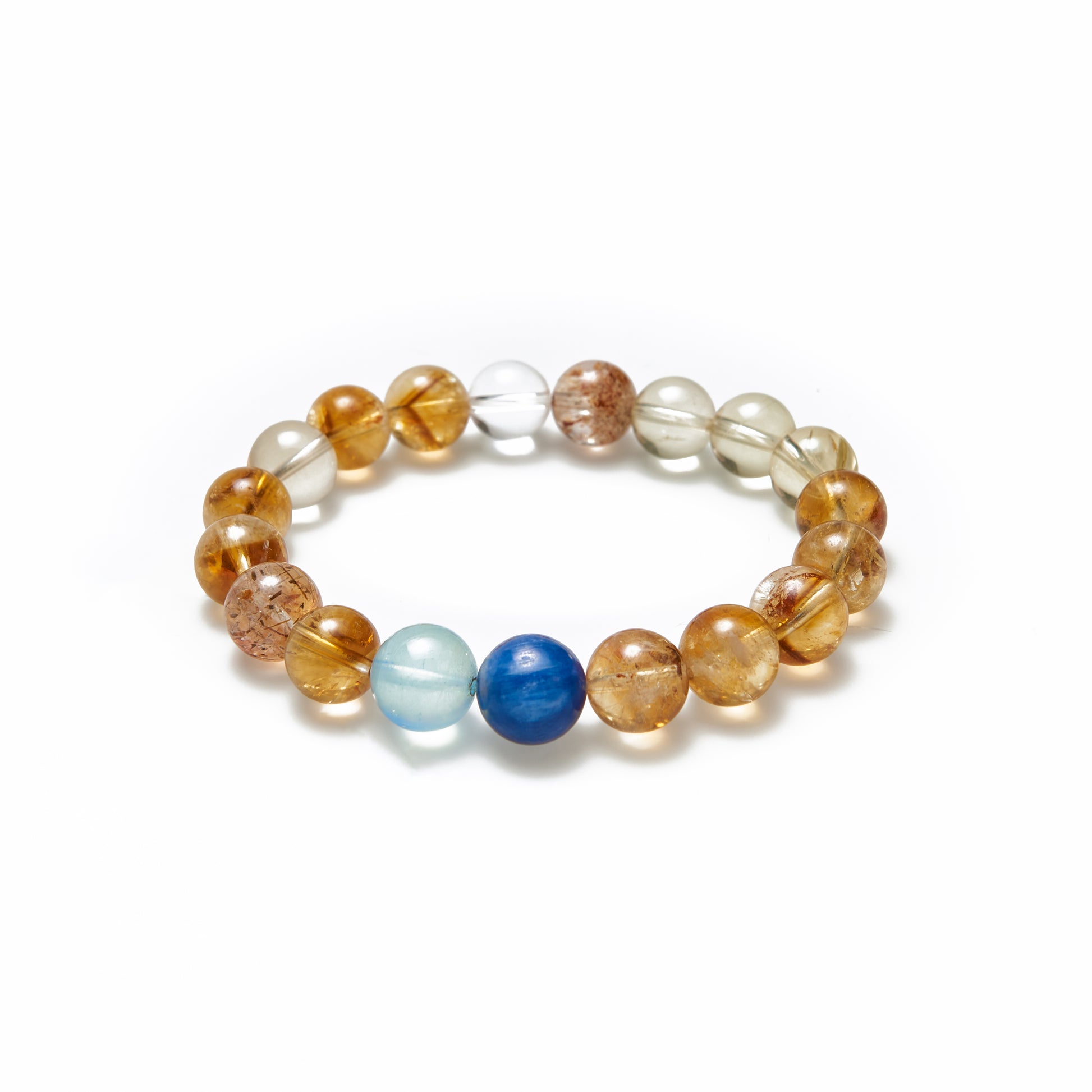 A signature piece of our design, this bracelet celebrates the striking blue eyes of some cats. It features yellow hair crystals, yellow tower crystals, yellow phantom crystals, one aquamarine, a deeper blue crystal, and a white crystal.