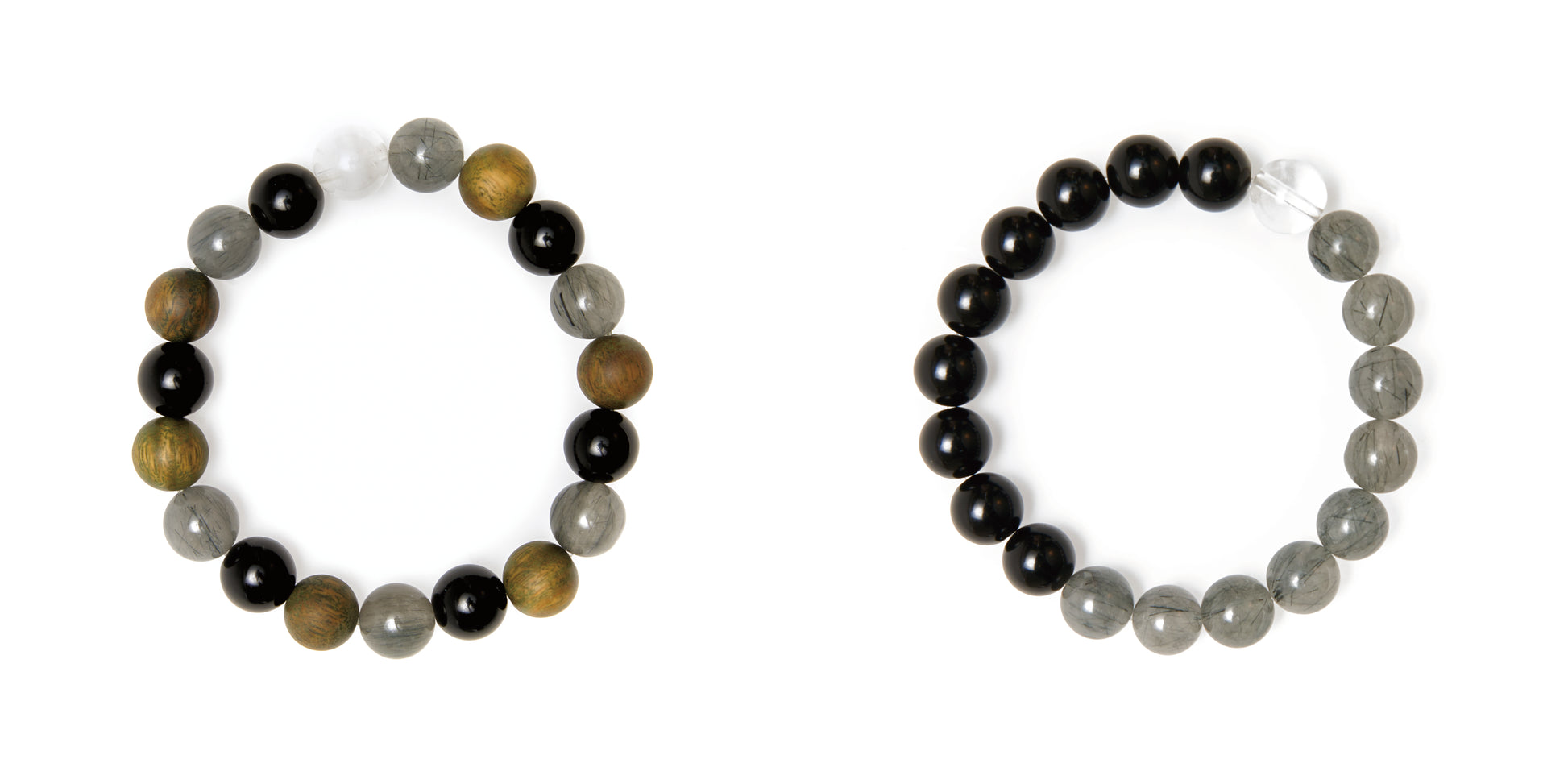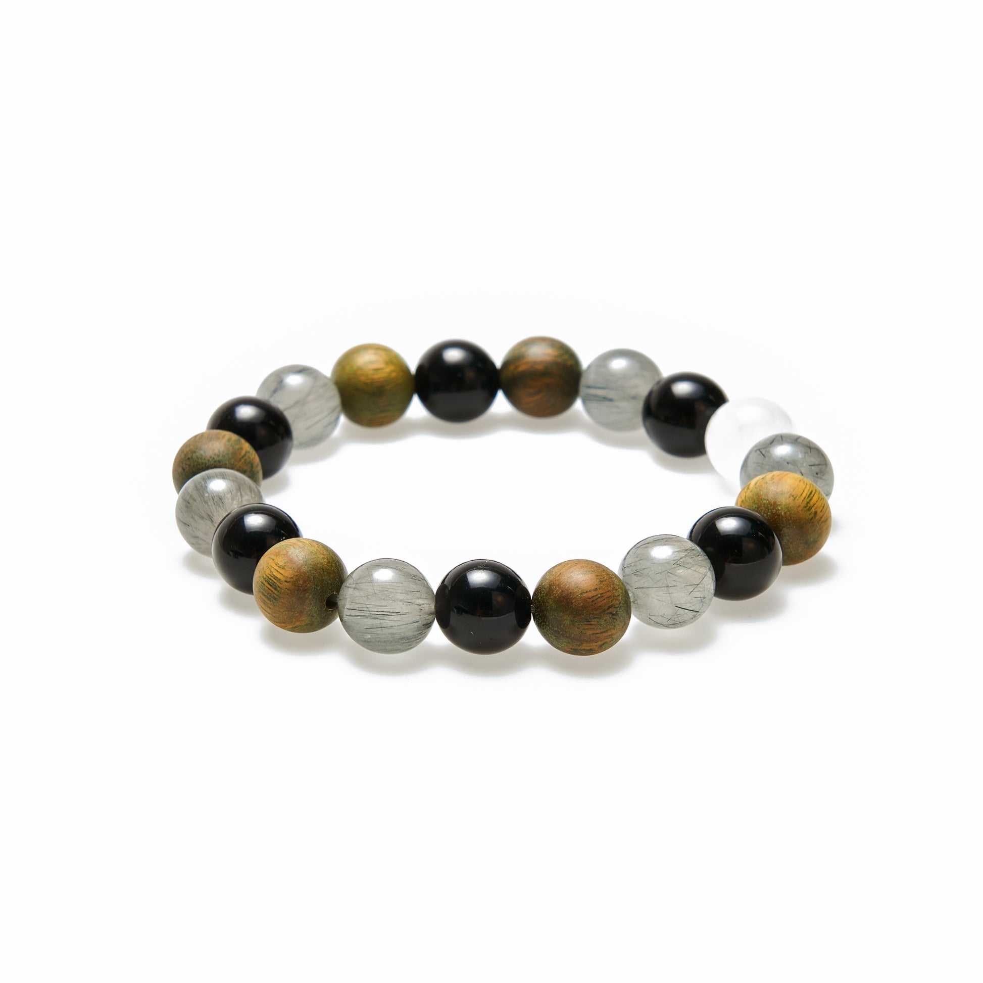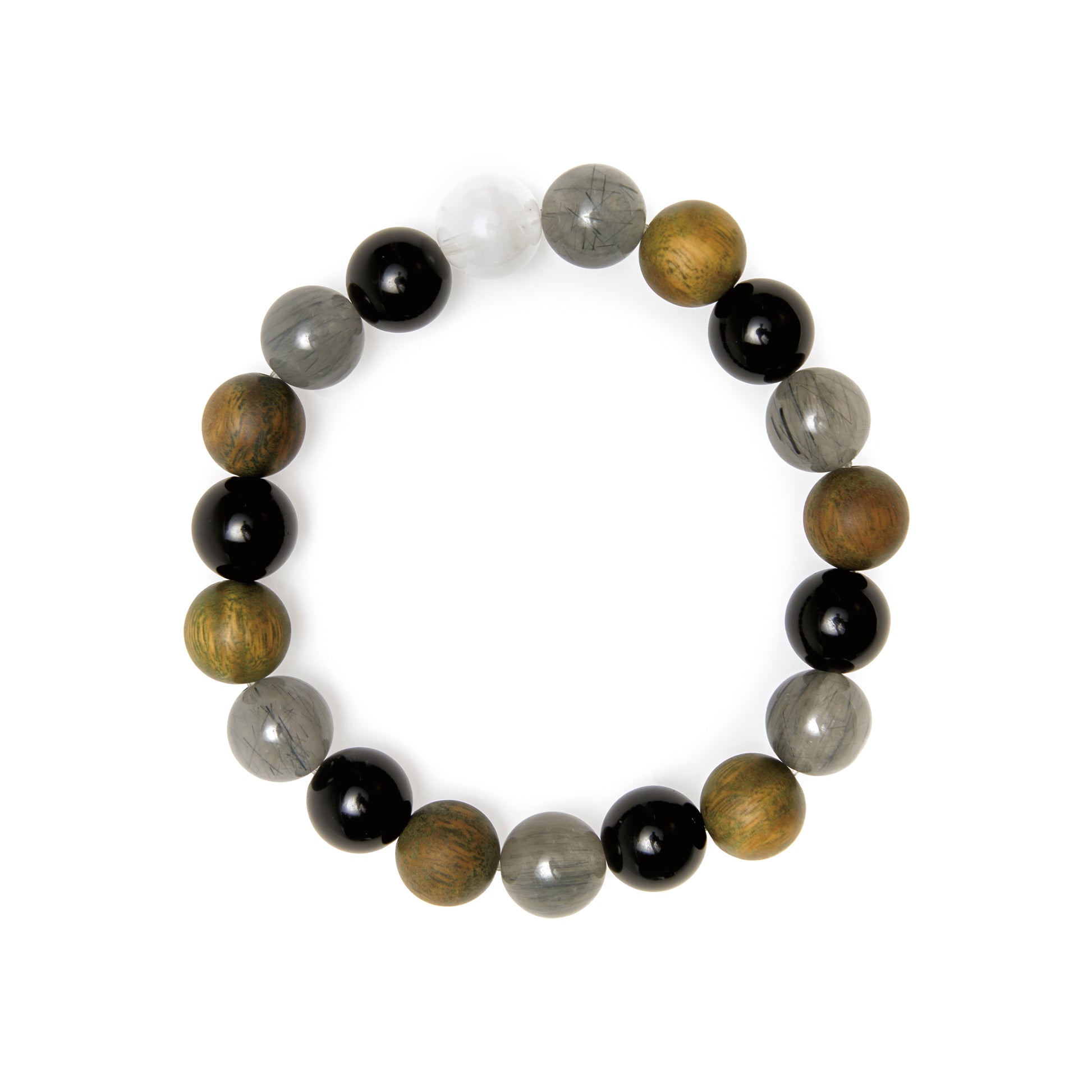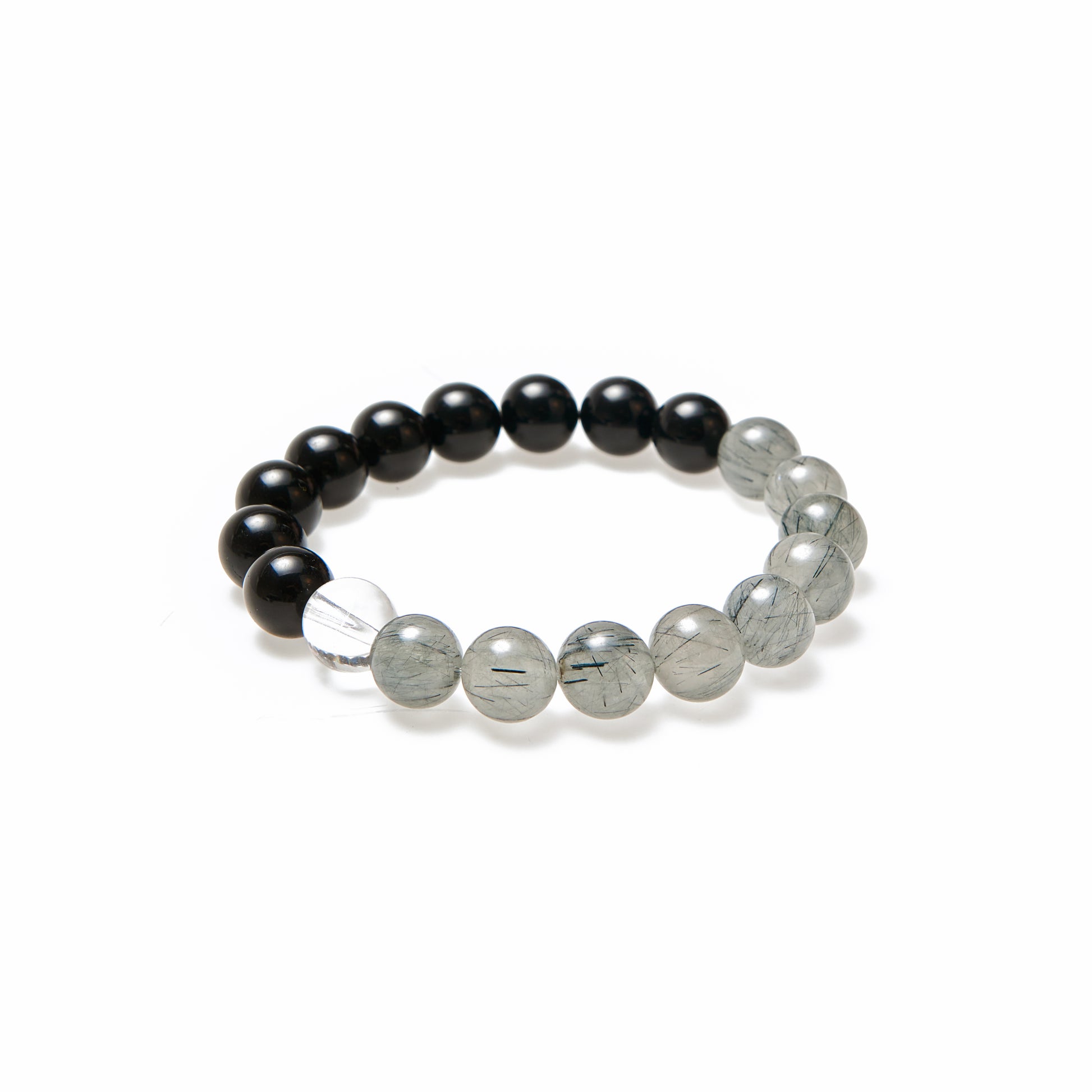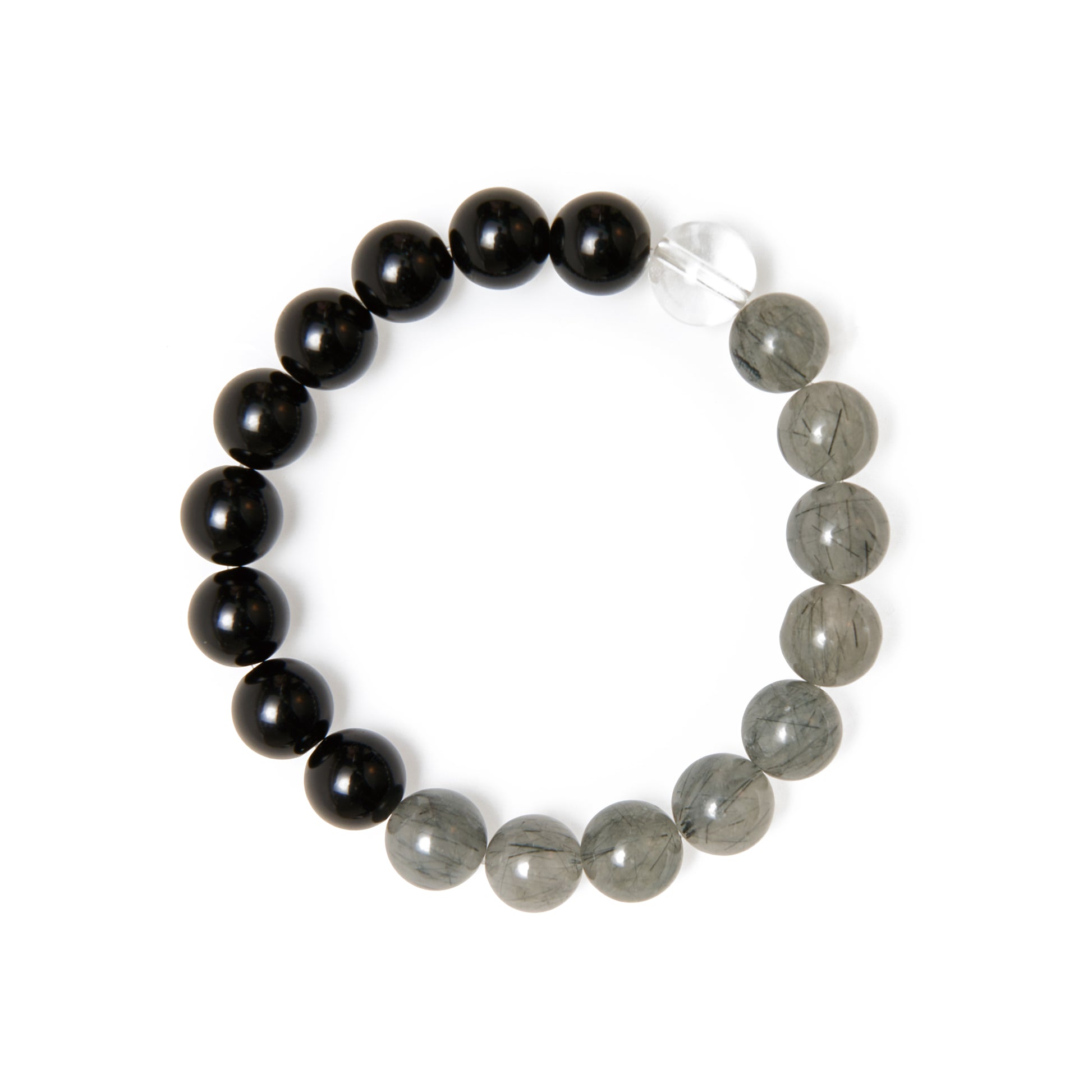 On the right: obsidian and grey rutilated quartz, grounded by a single clear quartz bead. Simple, steady, and strong -- ideal for a father’s wrist.