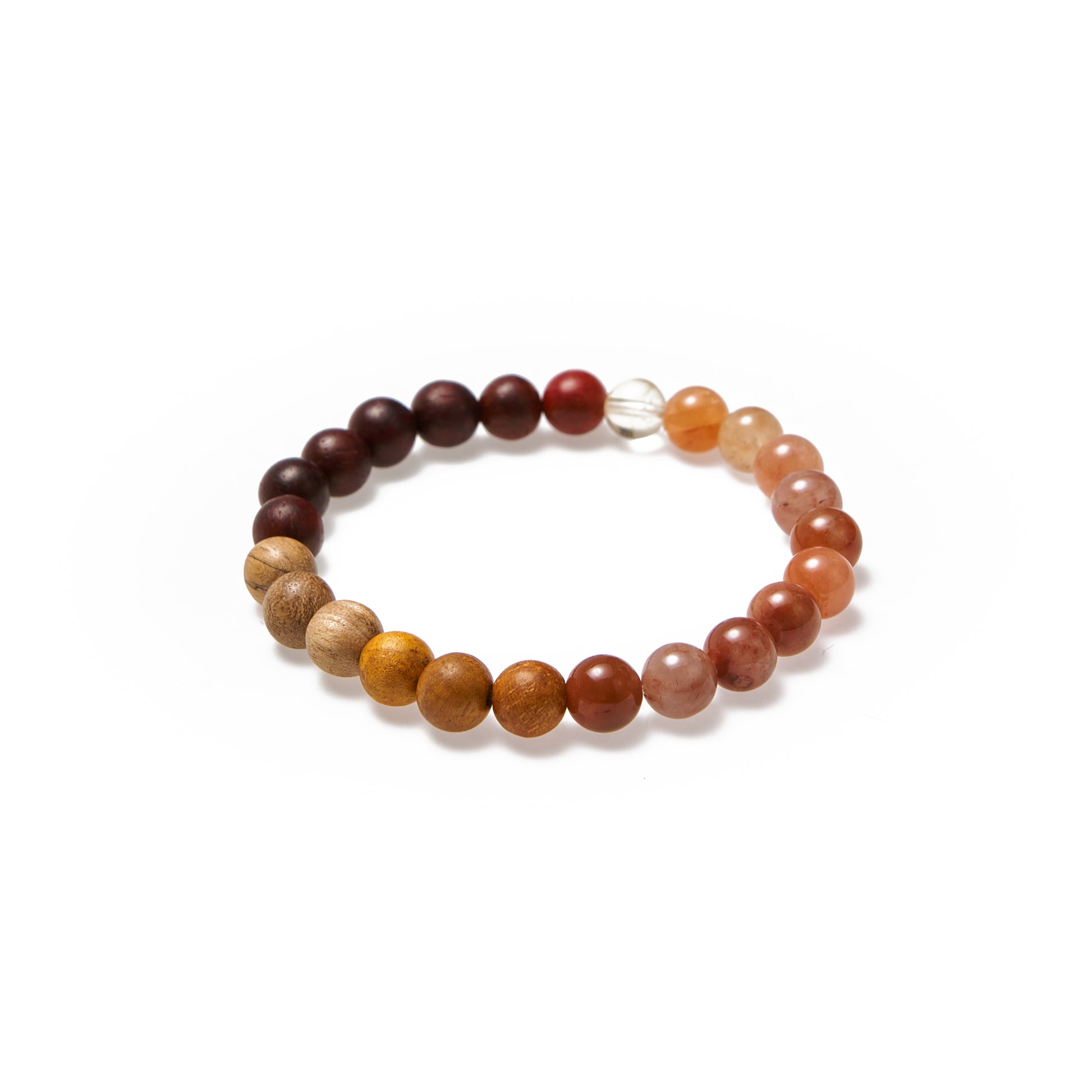 Inspired by the thousand-year-old Lingyin Temple in Hangzhou, this bracelet brings you essential peace, featuring yellow and red wooden beads, red cloud crystals, and a white crystal。