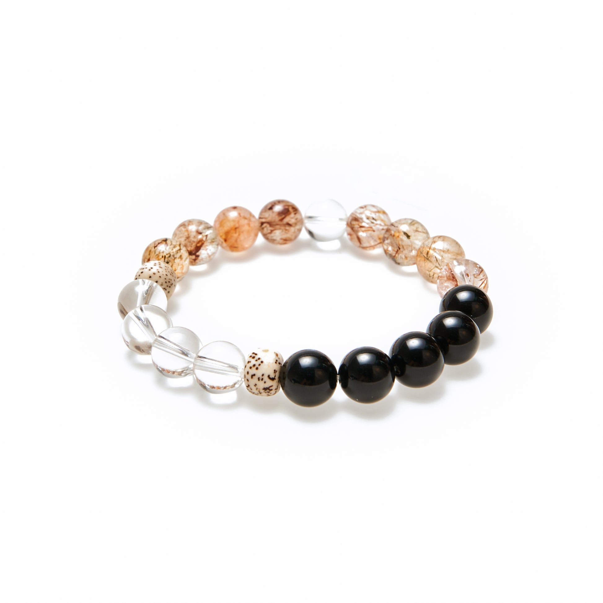 Inspired by the beautiful mosaic of white, black, and yellow found in calico cats, this bracelet combines white crystals, obsidian, and yellow hair crystals.
