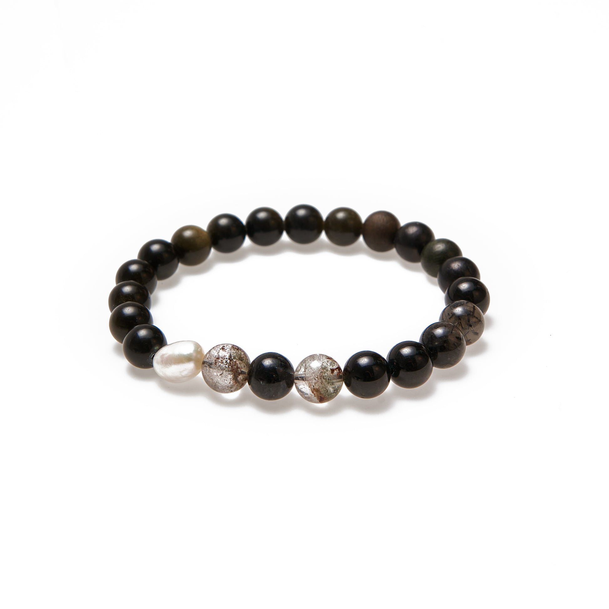 All-empowering black cats have long been believed to protect families and homes, bringing a sense of safety. This bracelet is dedicated to them, featuring a blend of obsidian, golden silk nanmu, green phantom crystals, and a single irregular pearl.