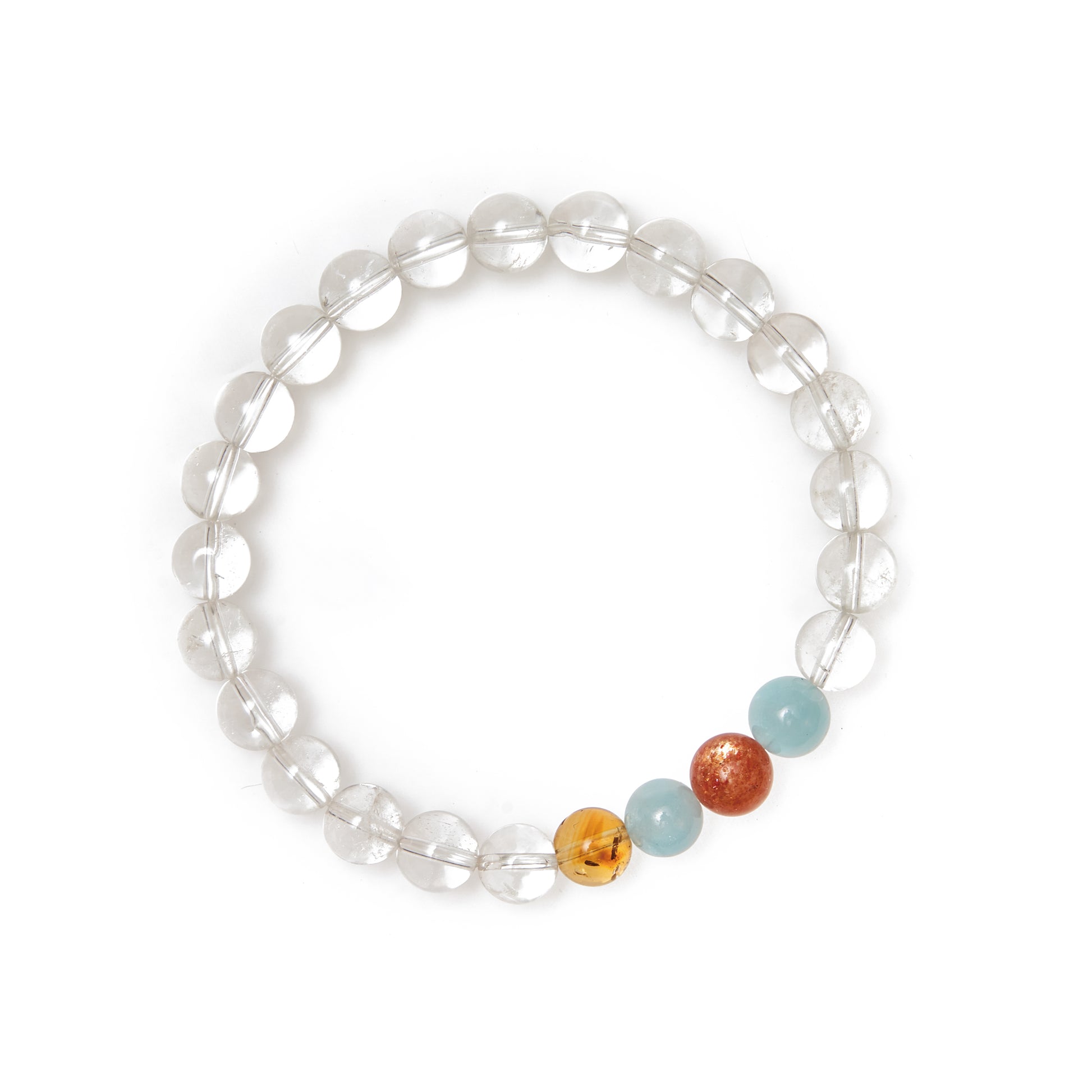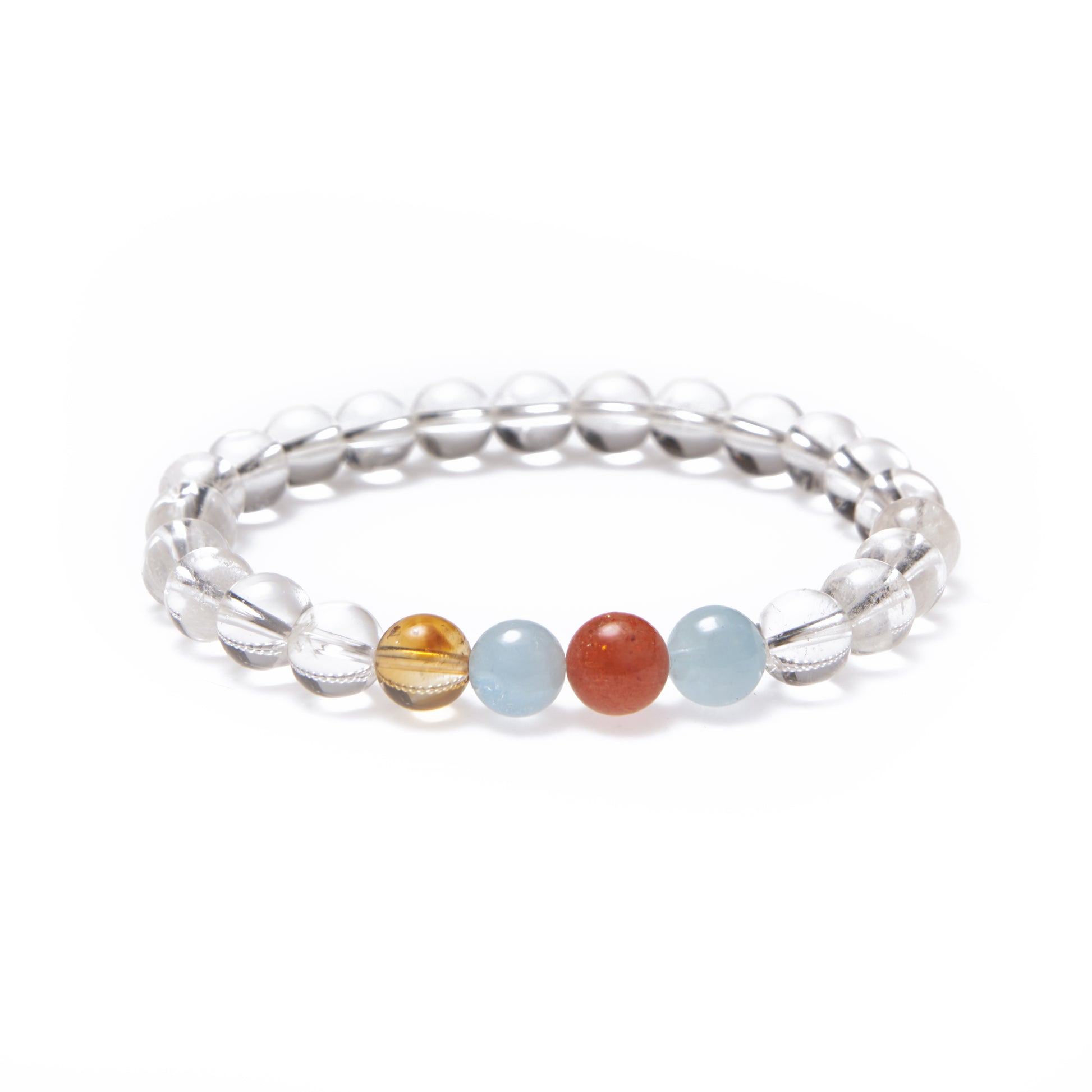 Who doesn’t love white cats? This bracelet is for them—celebrating their strikingly unique eyes, it features 8mm white quartz, one yellow tower gold bead, two aquamarine beads, and a single garnet.